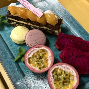 お客さまのお誕生日をお祝いしました。ケーキプレートやお部屋の飾り付けをご希望の方は事前にご相談ください。
