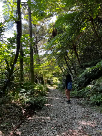 The first landmark to get to Fungar falls located in Makiya, Nago city, is a sacred place called Uinu-utaki. You can pray for safe travel in the small plaza with worship hall. Go straight on the narrow road for approximately 3 Km and you will reach the trailhead in about 10 min.. There is a small space for people to park their car. No vehicles are allowed from here.